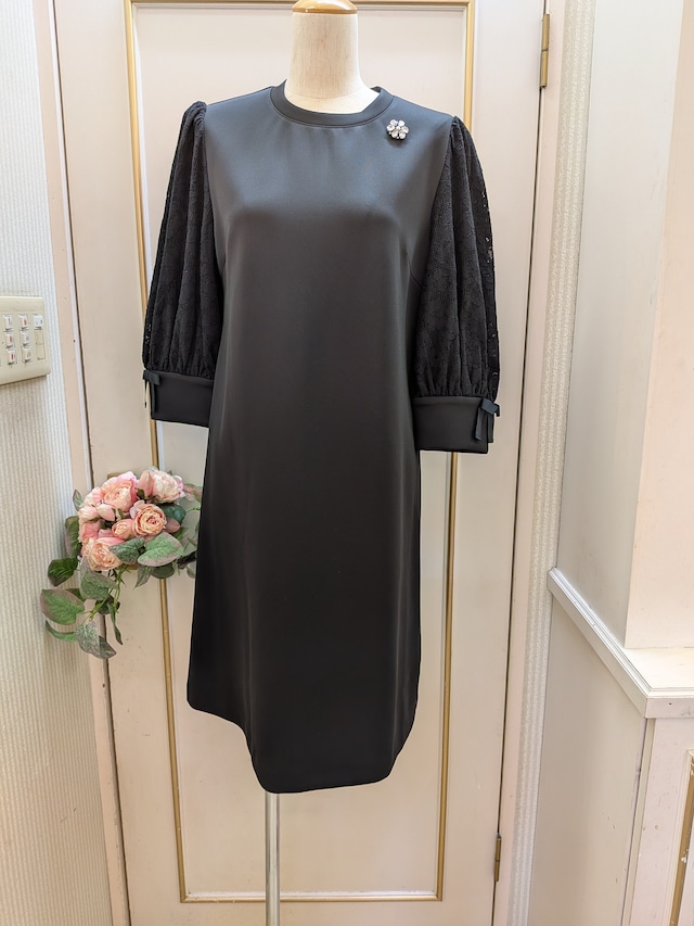 品番:2616007 定価(税抜) ¥17,000 掲載色 13(黒) スーパービューティー春夏ワンピース。 袖元のリボン、胸元ビジューがポイント。シンプルな黒のワンピースです♡