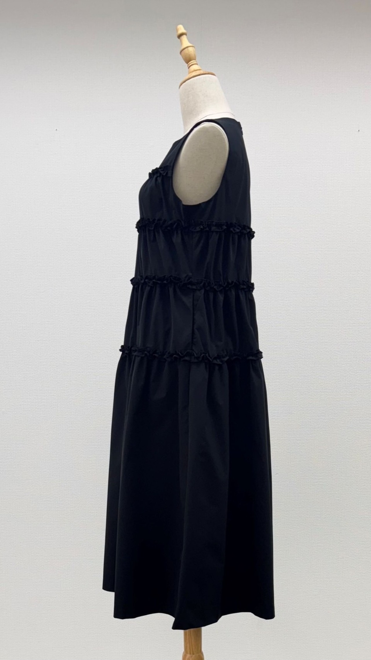 細めのフリルをあしらったティアードデザインは可愛いだけでなく、体の線を拾わないラインになっております。