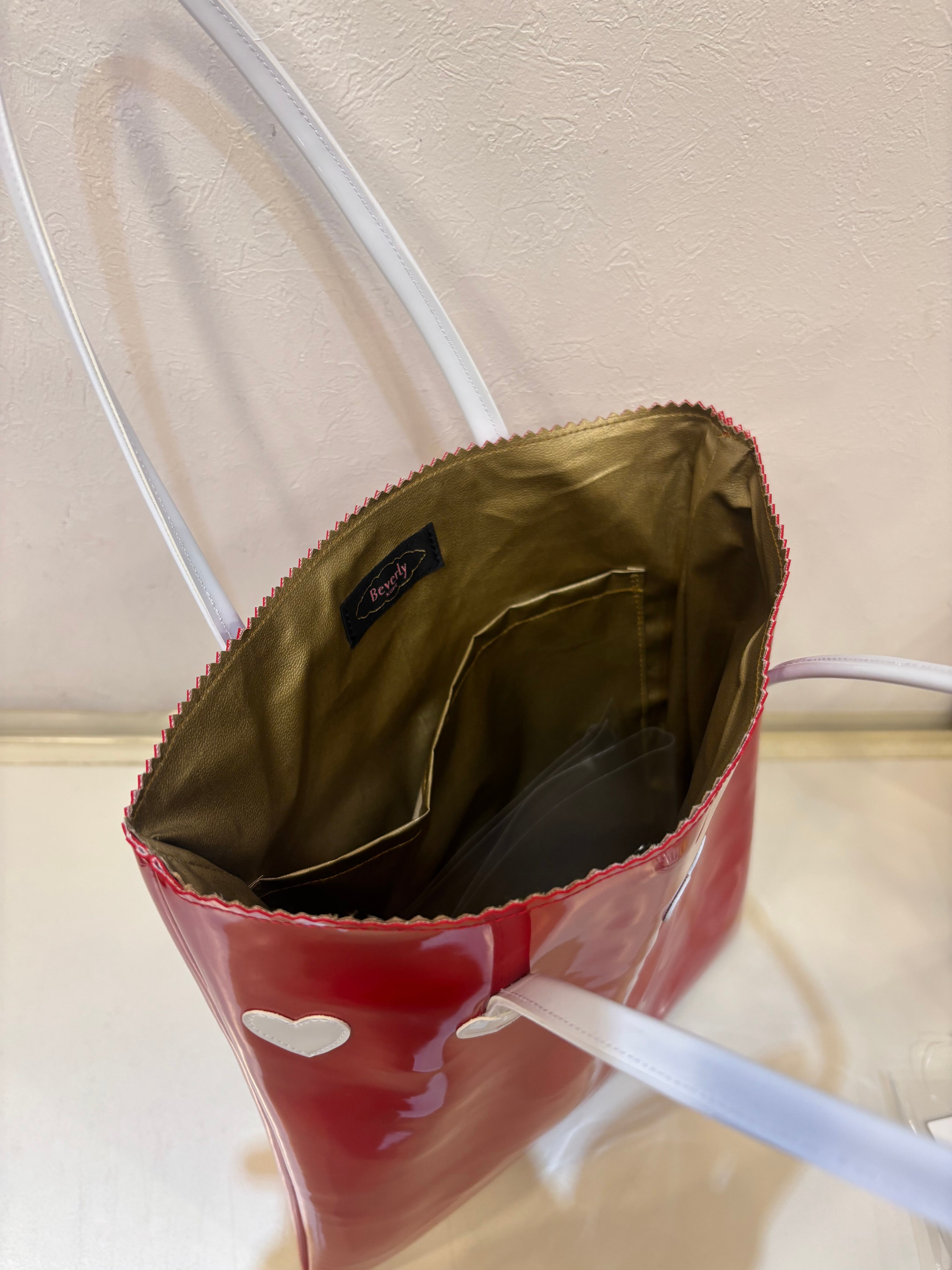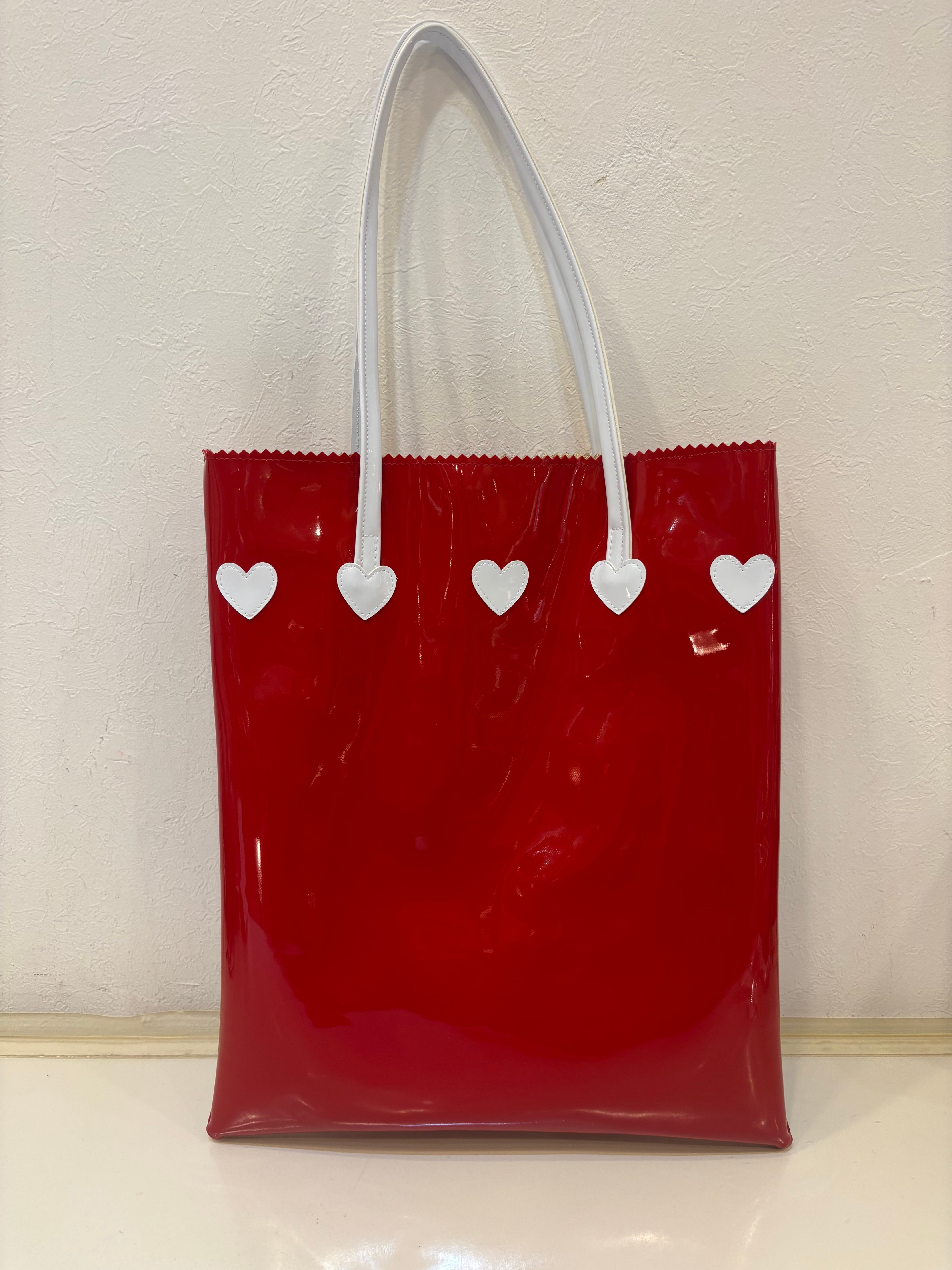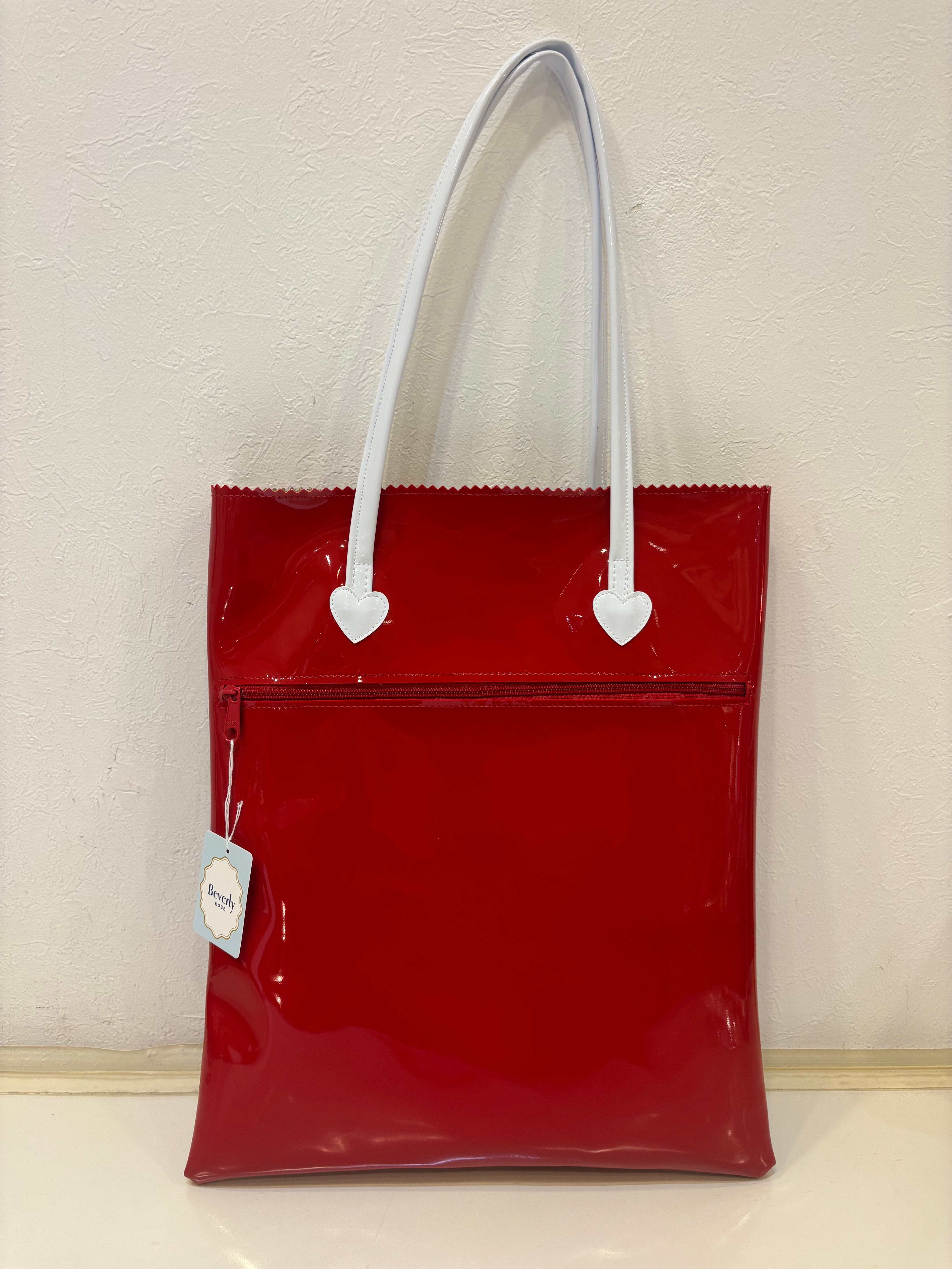 【神戸ブランド ビバリー】縦型エナメルトートバッグ ハート レッド×ホワイト