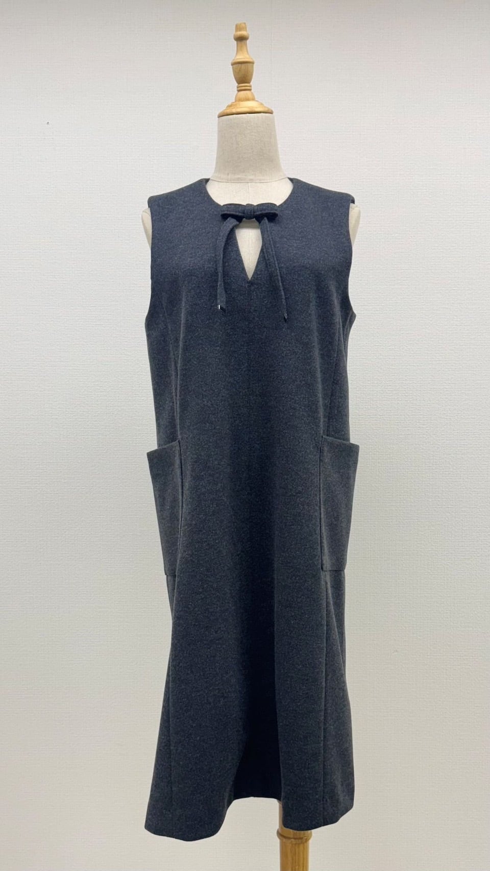 フロントに細めのワンポイントリボンとビックポケットのジャンパースカートです。