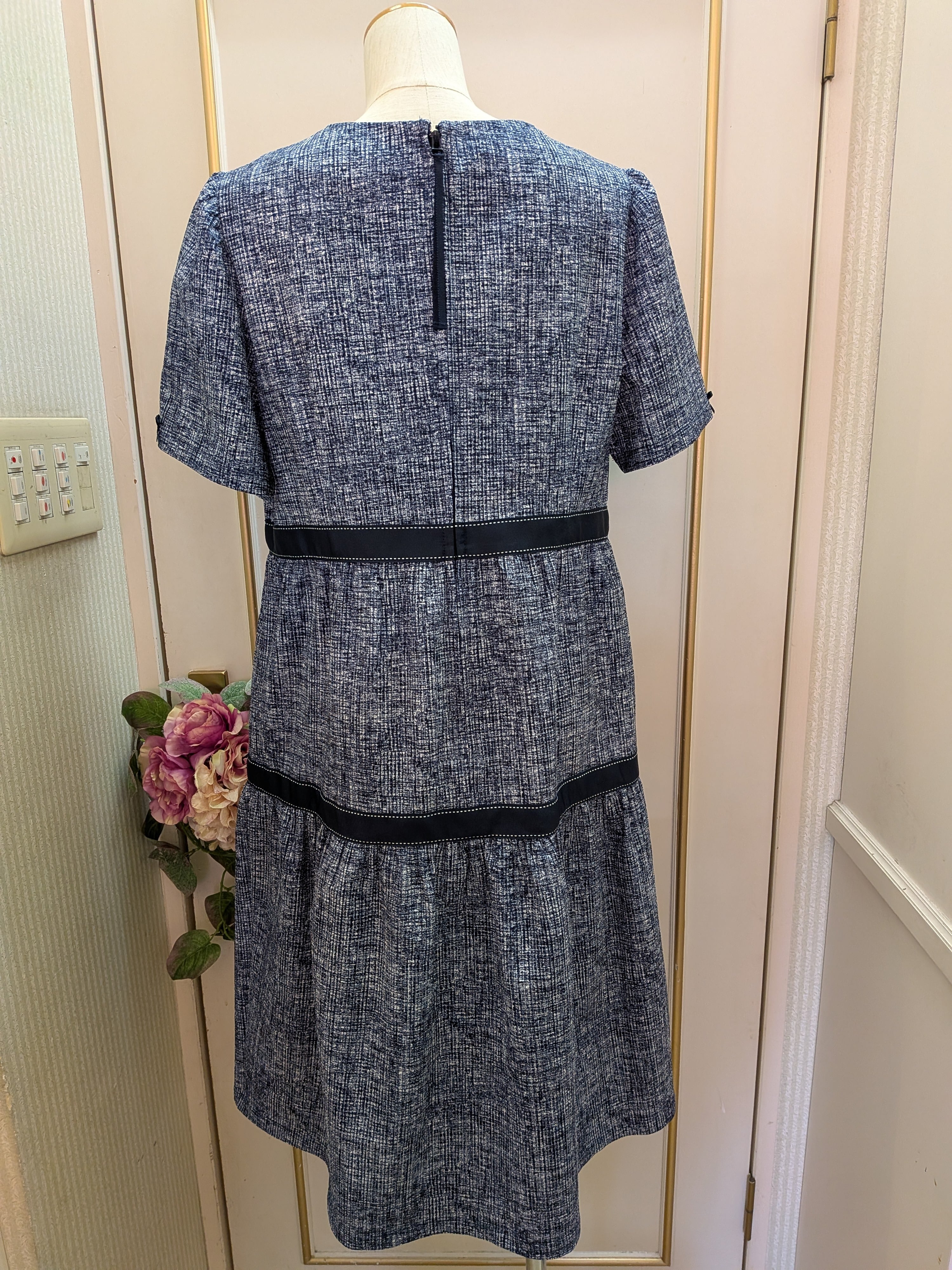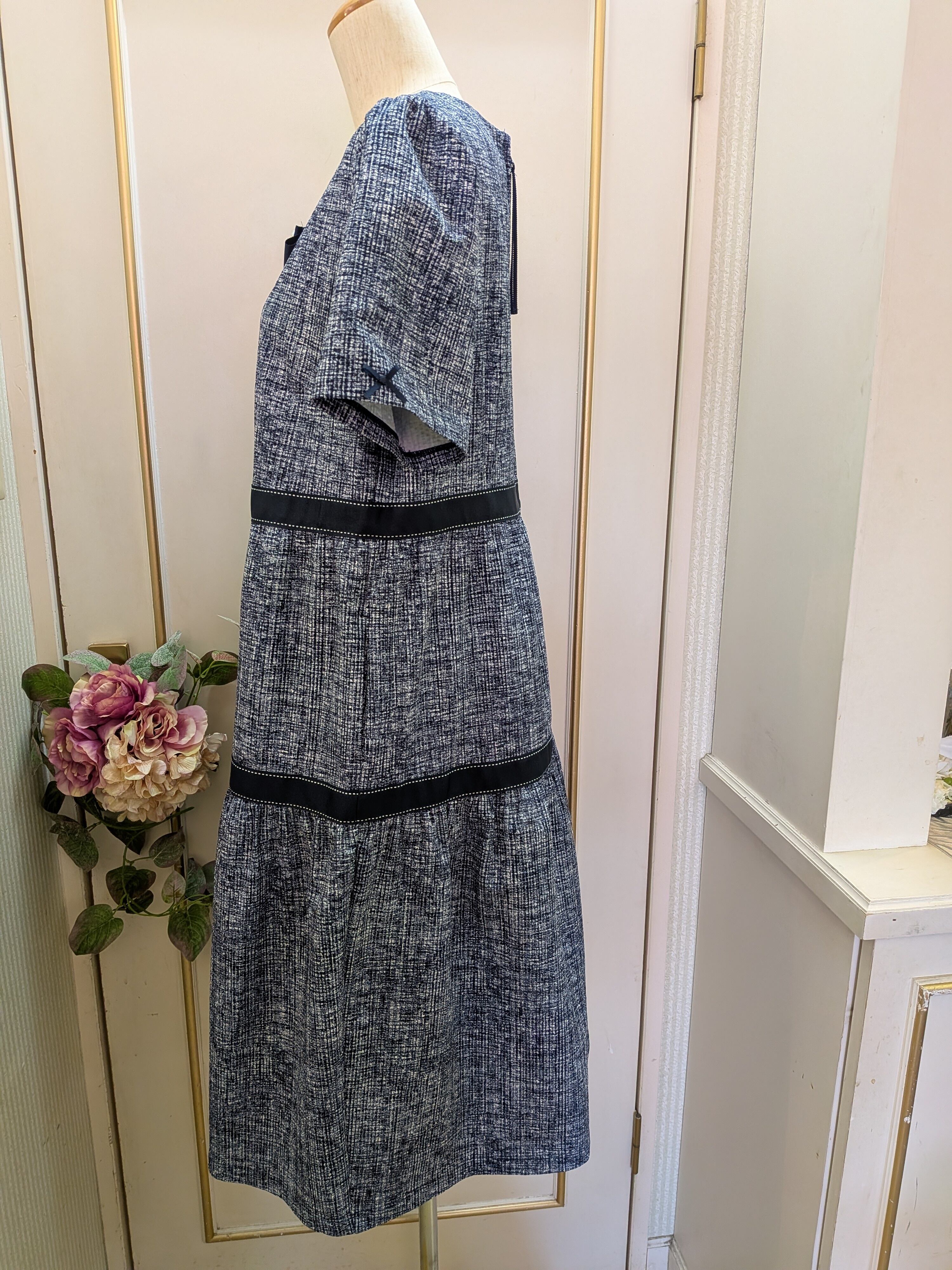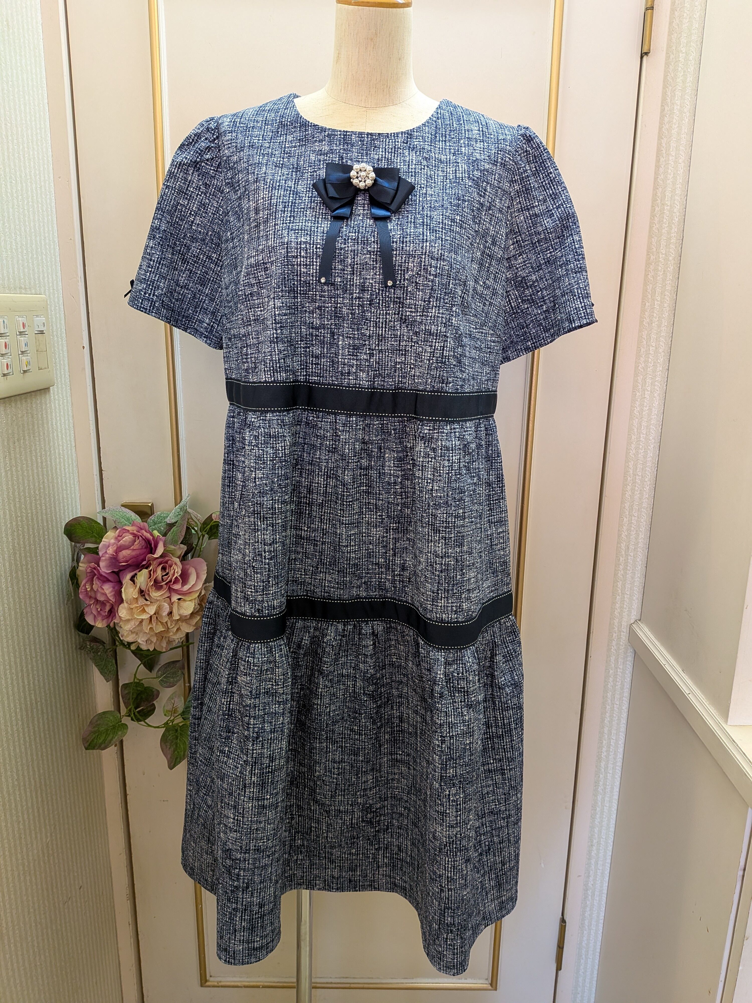 胸元リボンは取り外し可能です。ゆったりとしたシルエットが可愛らしい、紺色のワンピースです♡