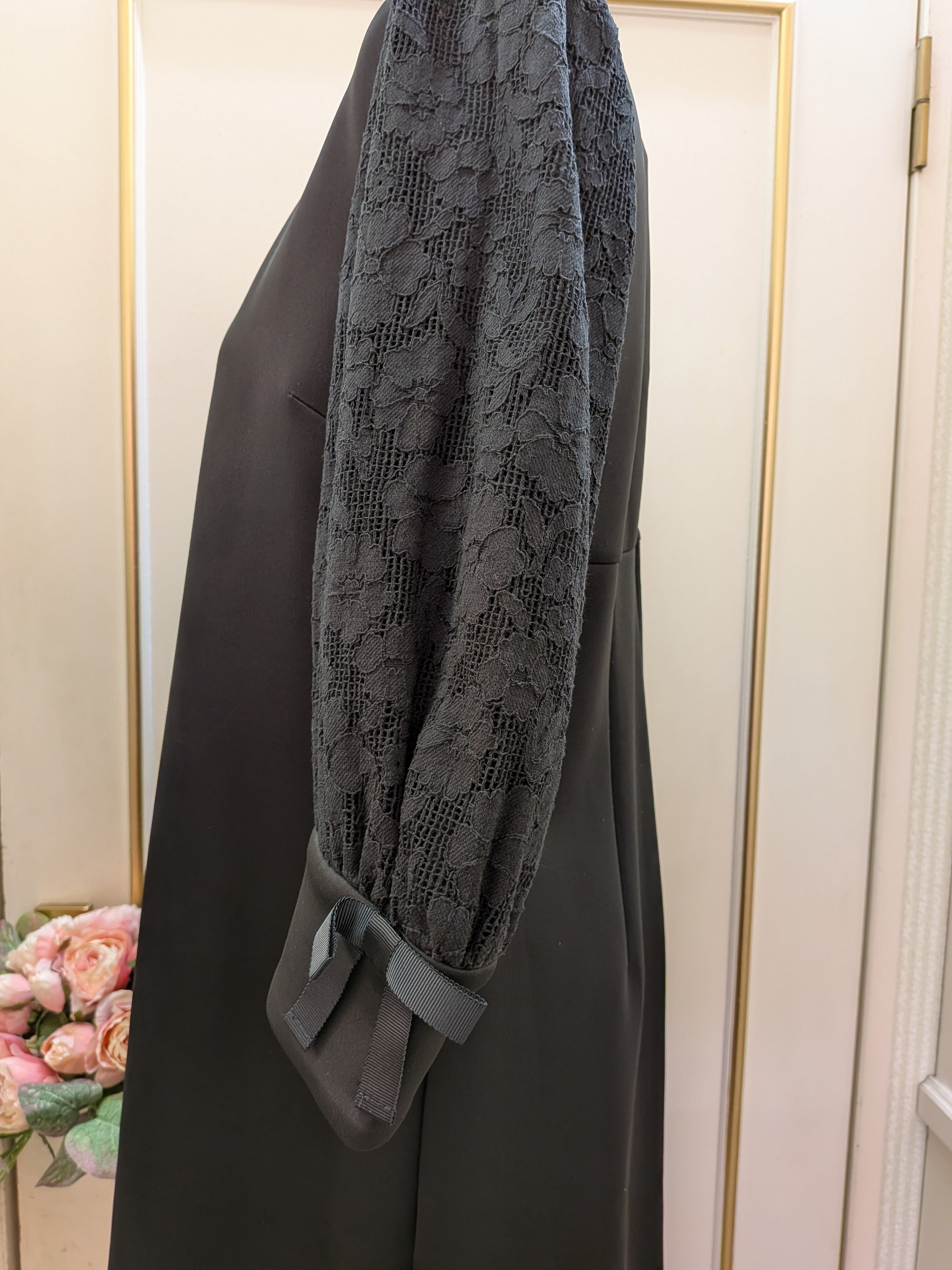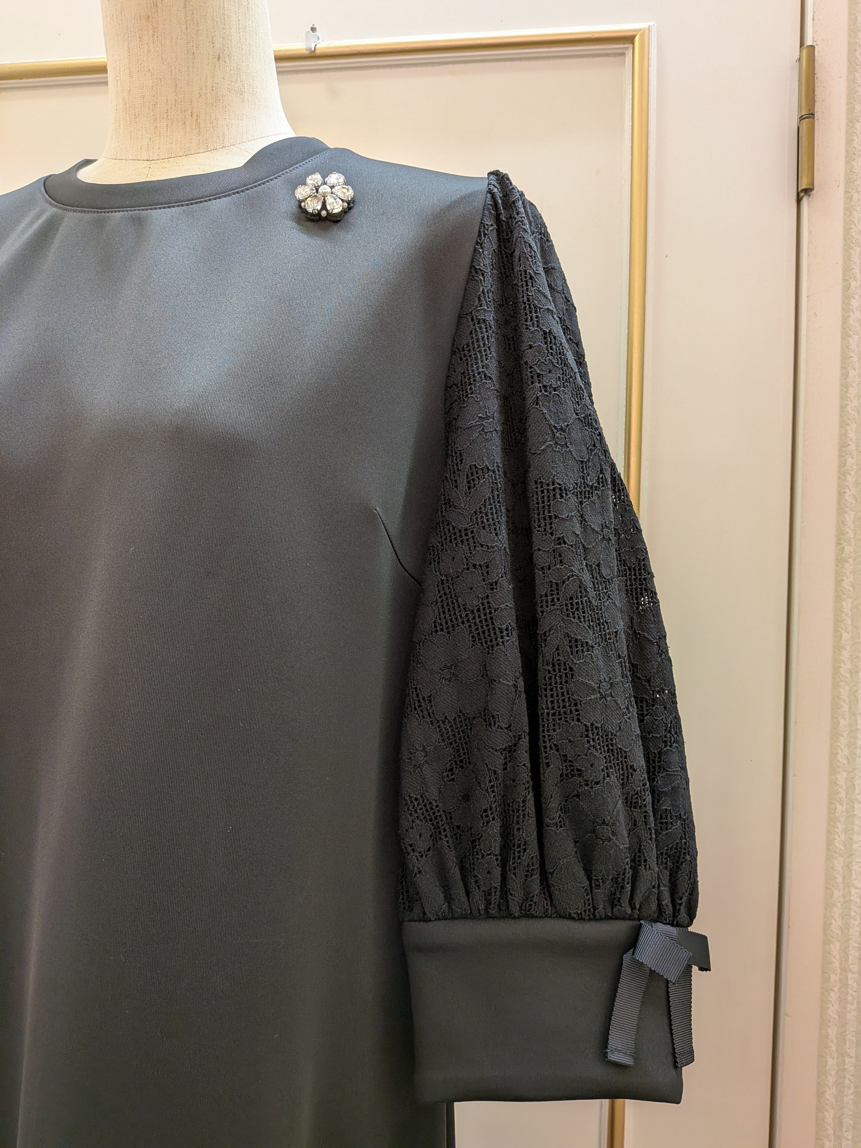 袖元のリボン、胸元ビジューがポイント。シンプルな黒のワンピースです♡