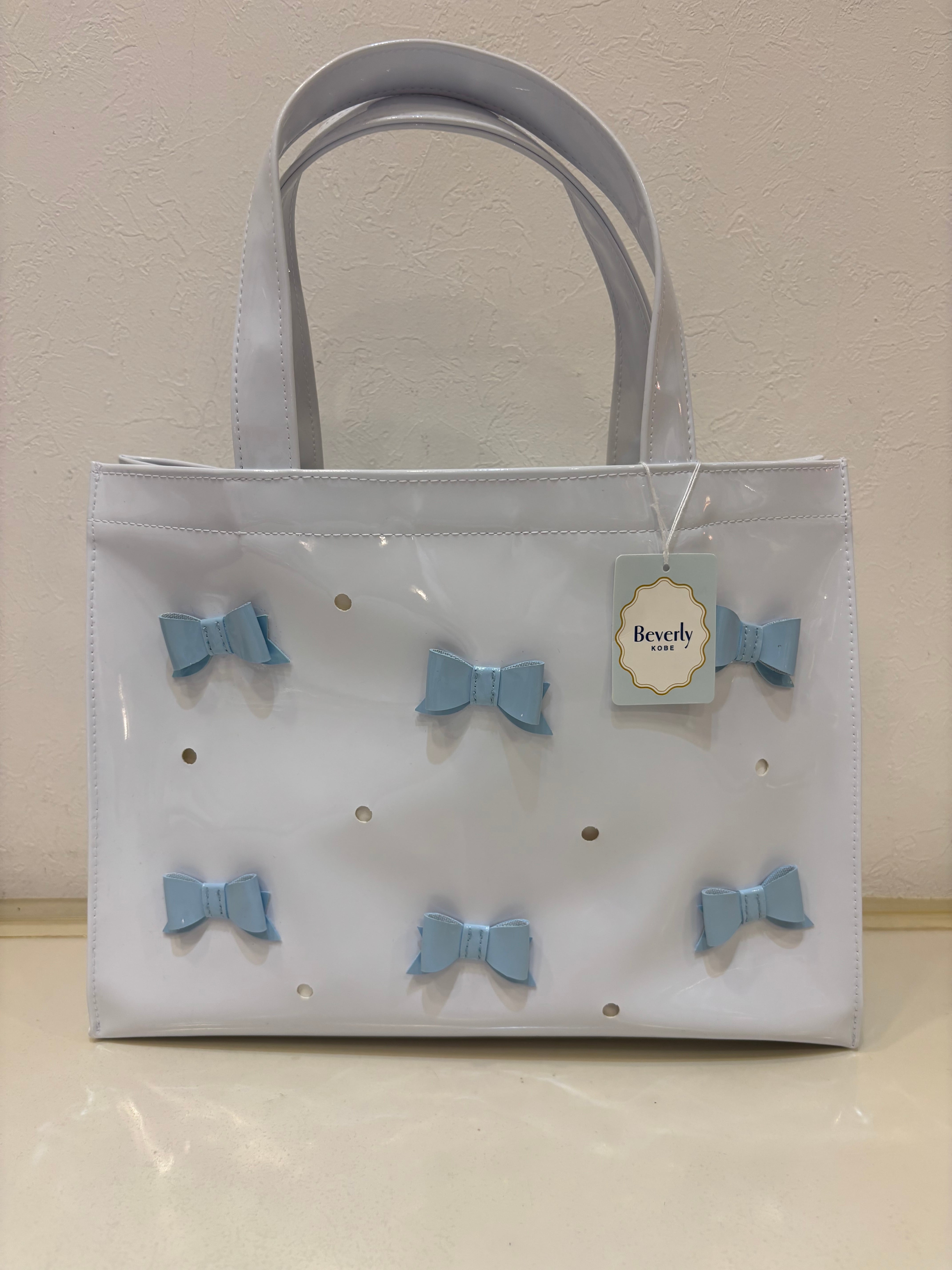 【神戸ブランド ビバリー】エナメルトートバッグ リボン ホワイト×ブルー
