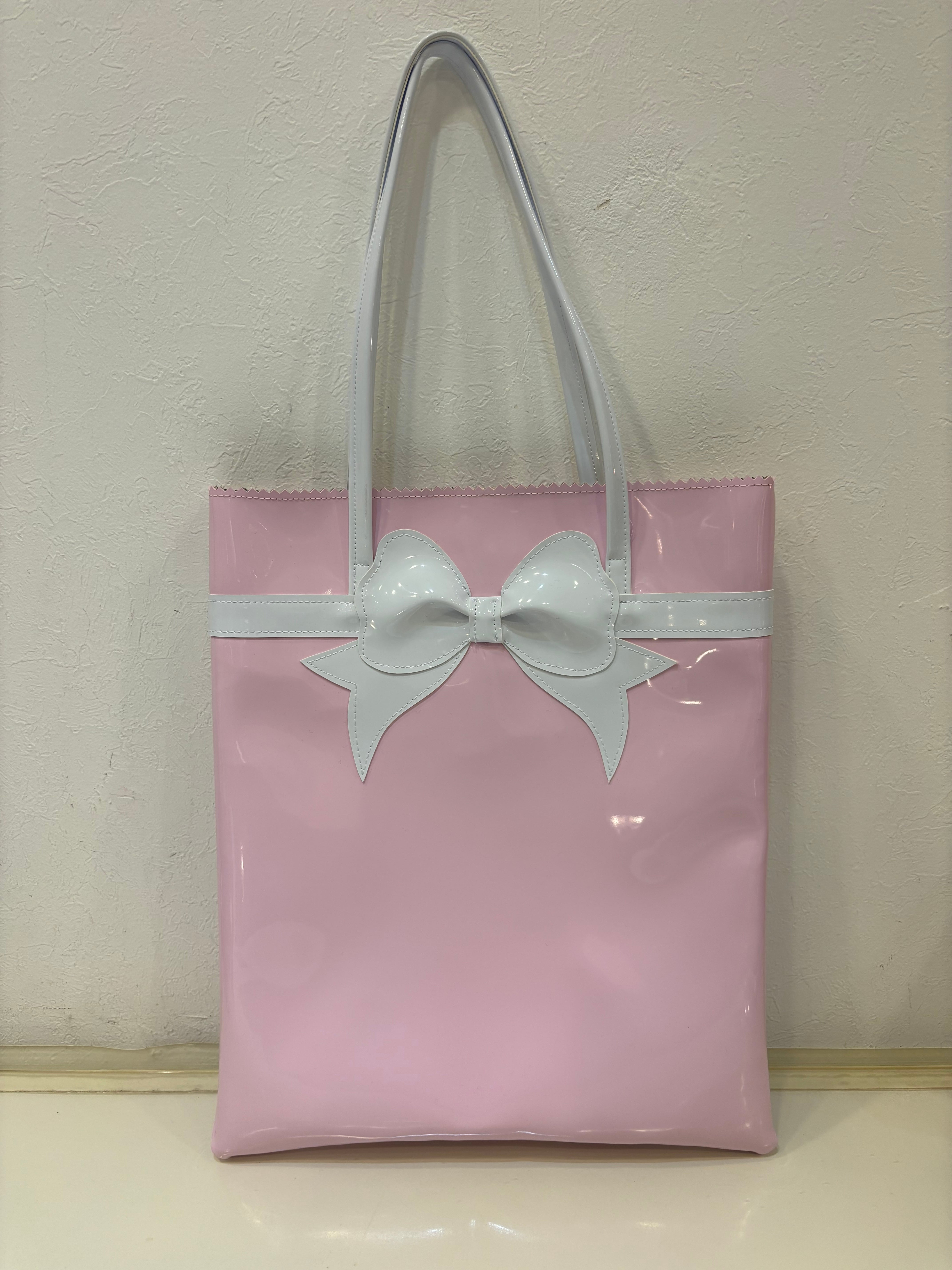 【神戸ブランド ビバリー】縦型エナメルトートバッグ リボン ピンク×ホワイト